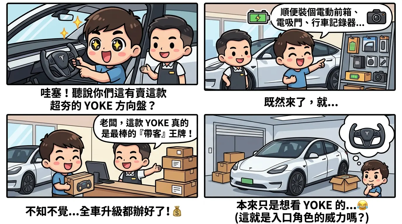 從 Tesla 改裝店的選品角度來看,Yoke 幾乎是每家必備的展示款,它的辨識度和傳播性讓它天然具備「帶客」功能。車主第一次走進改裝店,往往就是因為 Yoke 這個進場理由,然後順帶評估行車記錄器、電動前箱、電吸門等其他配件。Yoke 在整個 Tesla 改裝生態裡扮演的是入口商品的角色,這讓它的市場地位遠比售價本身更重要。